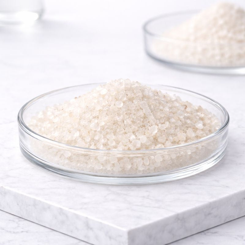 Die Substanz liegt in kristalliner Form vor und weist eine leicht transluzente bis opake Struktur mit heller, creme- bis weißlicher Färbung auf. Die unregelmäßige Kristallmorphologie ermöglicht eine klare visuelle Identifikation im Rahmen analytischer Arbeiten.